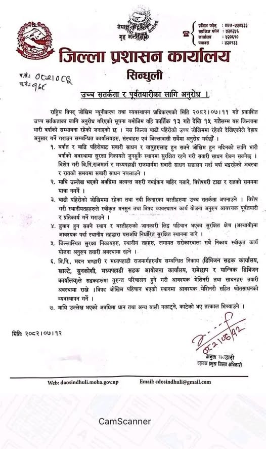 सहायक प्रमुख जिल्ला अधिकारी अनुज भण्डारीले जारी गरेको सूचनामा बाढी, पहिरो र डुबानको जोखिम उच्च रहेकाले नागरिक, स्थानीय तह, सरकारी तथा गैरसरकारी निकाय सबैलाई सचेत रहन आग्रह गरिएको छ । सूचनामा वर्षा र बाढीका कारण हुन सक्ने मानवीय र भौतिक क्षति रोकथामका लागि सात बुँदे सावधानीका निर्देशहरू दिइएको छ ।सूचनाअनुसार भारी वर्षाको अवस्थामा सवारी साधन र यात्रुहरूलाई हुने जोखिम कम गर्न सुरक्षाकर्मीले आवश्यकताअनुसार सडकमा सवारी साधन रोक्न सक्ने व्यवस्था गरिएको छ ।