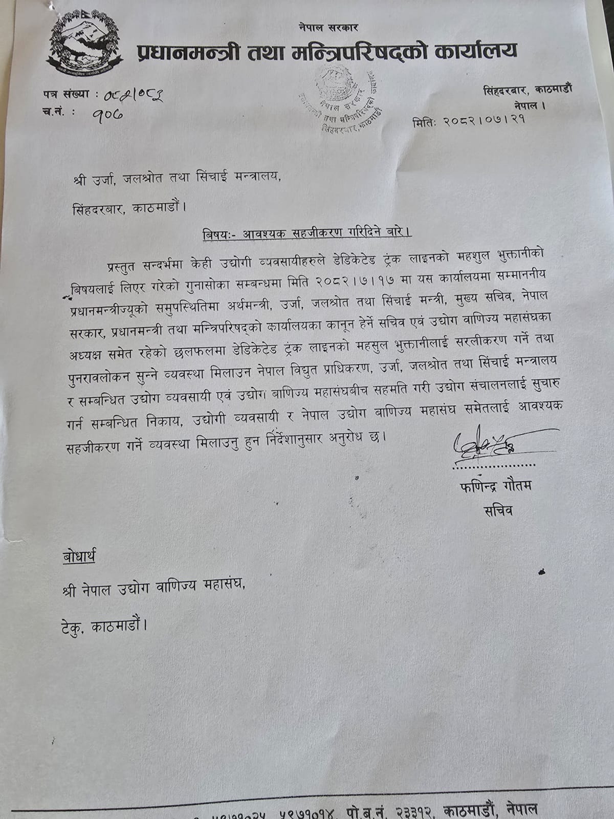 मन्त्रालयका सचिव फणिन्द्र गौतमद्वारा हस्ताक्षरित पत्रमा, व्यवसायीहरूले गरेको गुनासो समाधान गर्ने र शुल्क प्रणालीलाई अधिक सरल र उद्योग अनुकूल बनाउन आवश्यक गृहकार्य सुरु गरिएको उल्लेख छ ।