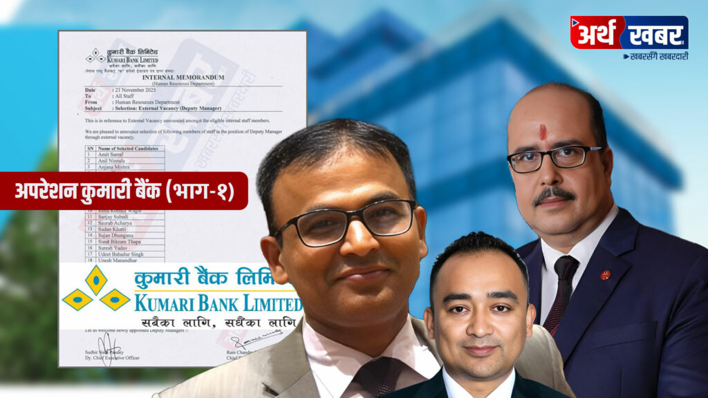 काठमाडौँ । कुमारी बैंक लिमिटेडका सीइओ राम चन्द्र खनाल र डेपुटी सीइओ सुधिर नाथ पाण्डेमाथि कर्मचारी विनियमावली, र प्रचलित कानुनलाई मिचेर १८ जनाको गैरकानुनी रुपमा बढुवा गरेको आरोप लागेको छ । बैंकले २१ नोभेम्बर, २०२५ मा एक पत्र जारी गरेर १८ जनाको पुनर्नियुक्ति गरिने भन्दै पत्राचार गरेपछि यो विषय बाहिर आएको हो । १८ जनाको … Continue reading Exclusive : कुमारी बैंकमा ‘चोर बाटो’बाट पुनर्नियुक्तिका नाममा १८ जनाको ‘गैरकानुनी बढुवा’ ! (इन्टरनल मेमोसहित)