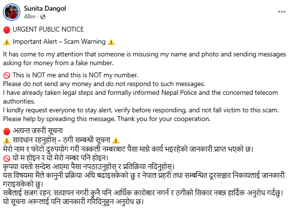 उपमेयर डंगोलले लेखेकी छन्, ‘मेरो नाम र फोटो दुरुपयोग गरी नक्कली नम्बरबाट पैसा माग्ने कार्य भइरहेको जानकारी प्राप्त भएको छ । यो म होइन र यो मेरो नम्बर पनि होइन । कृपया यस्तो सन्देश आएमा पैसा नपठाउनुहोस् र प्रतिक्रिया पनि नदिनुहोस् ।’