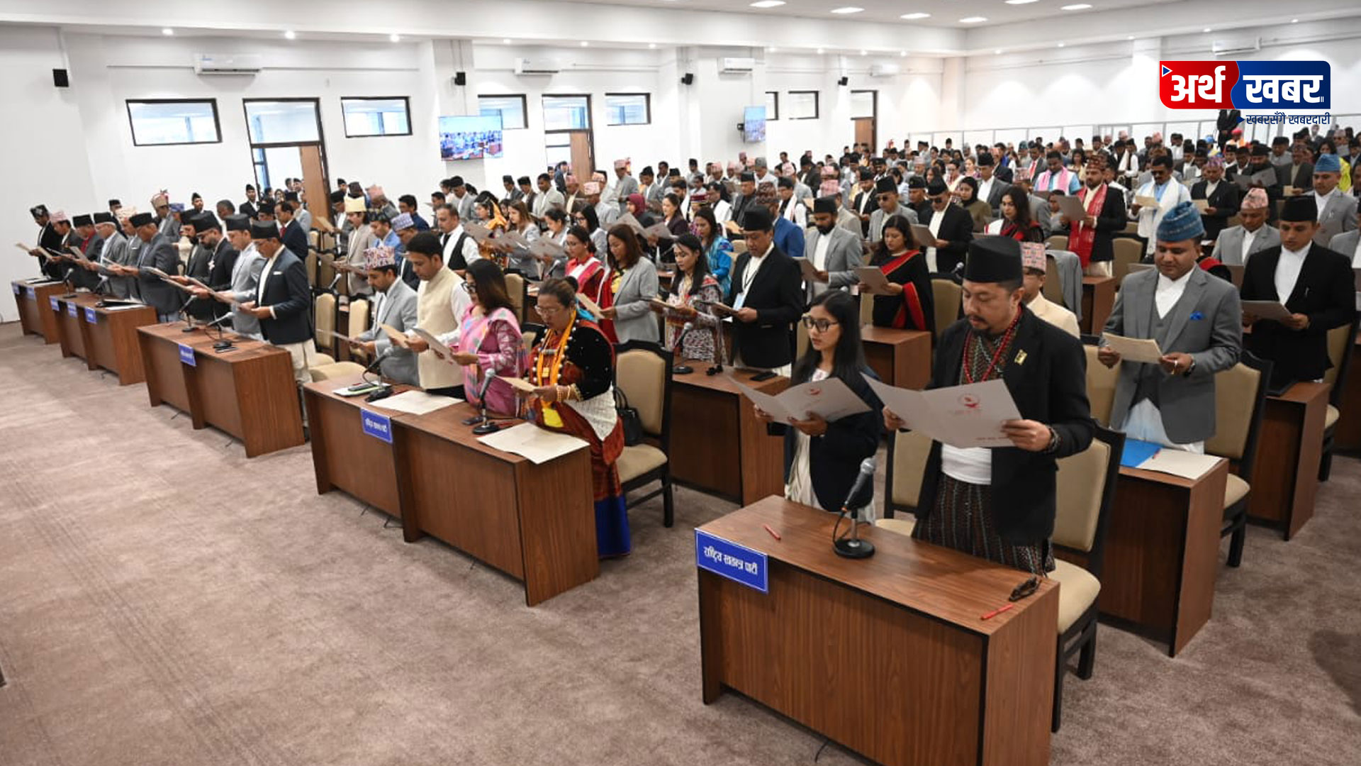 नवनिर्वाचित सासंदहरु थरीथरी भेषभूषामामा शपथ लिन सिंहदरबारस्थित संसद् भवनको हलमा पुगेका थिए ।प्रतिनिधि सभा सदस्य निर्वाचन ऐन, २०७४ को दफा ७५ अनुसार सदस्यले प्रतिनिधिसभा वा त्यसको कुनै समितिको बैठकमा भाग लिनुअघि प्रतिनिधिसभाको अध्यक्षता गर्ने व्यक्तिसमक्ष शपथ लिनुपर्ने व्यवस्था रहेको छ ।