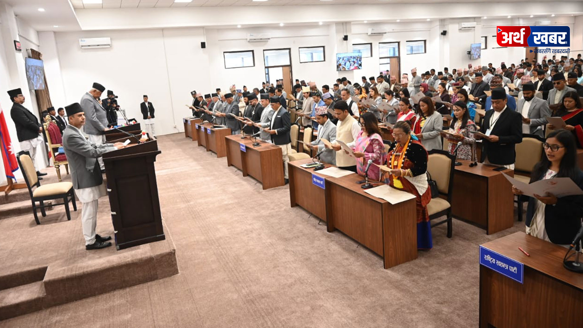 नवनिर्वाचित सासंदहरु थरीथरी भेषभूषामामा शपथ लिन सिंहदरबारस्थित संसद् भवनको हलमा पुगेका थिए ।प्रतिनिधि सभा सदस्य निर्वाचन ऐन, २०७४ को दफा ७५ अनुसार सदस्यले प्रतिनिधिसभा वा त्यसको कुनै समितिको बैठकमा भाग लिनुअघि प्रतिनिधिसभाको अध्यक्षता गर्ने व्यक्तिसमक्ष शपथ लिनुपर्ने व्यवस्था रहेको छ ।