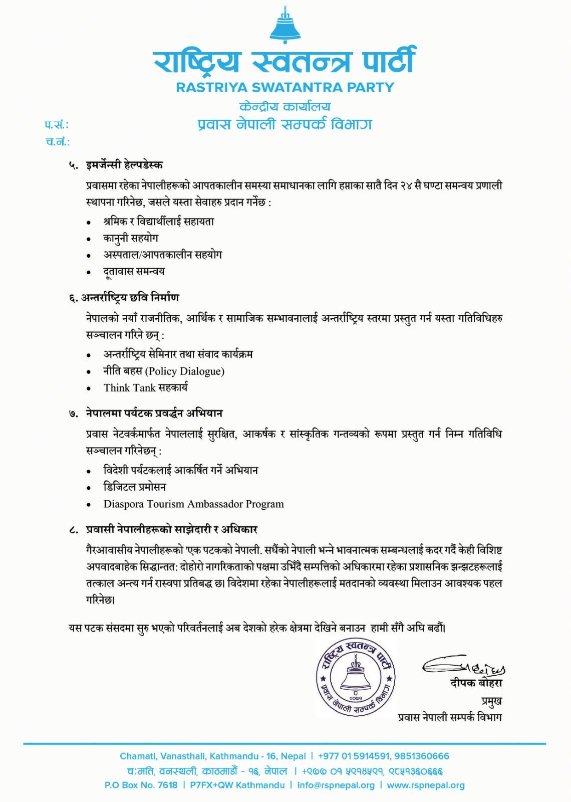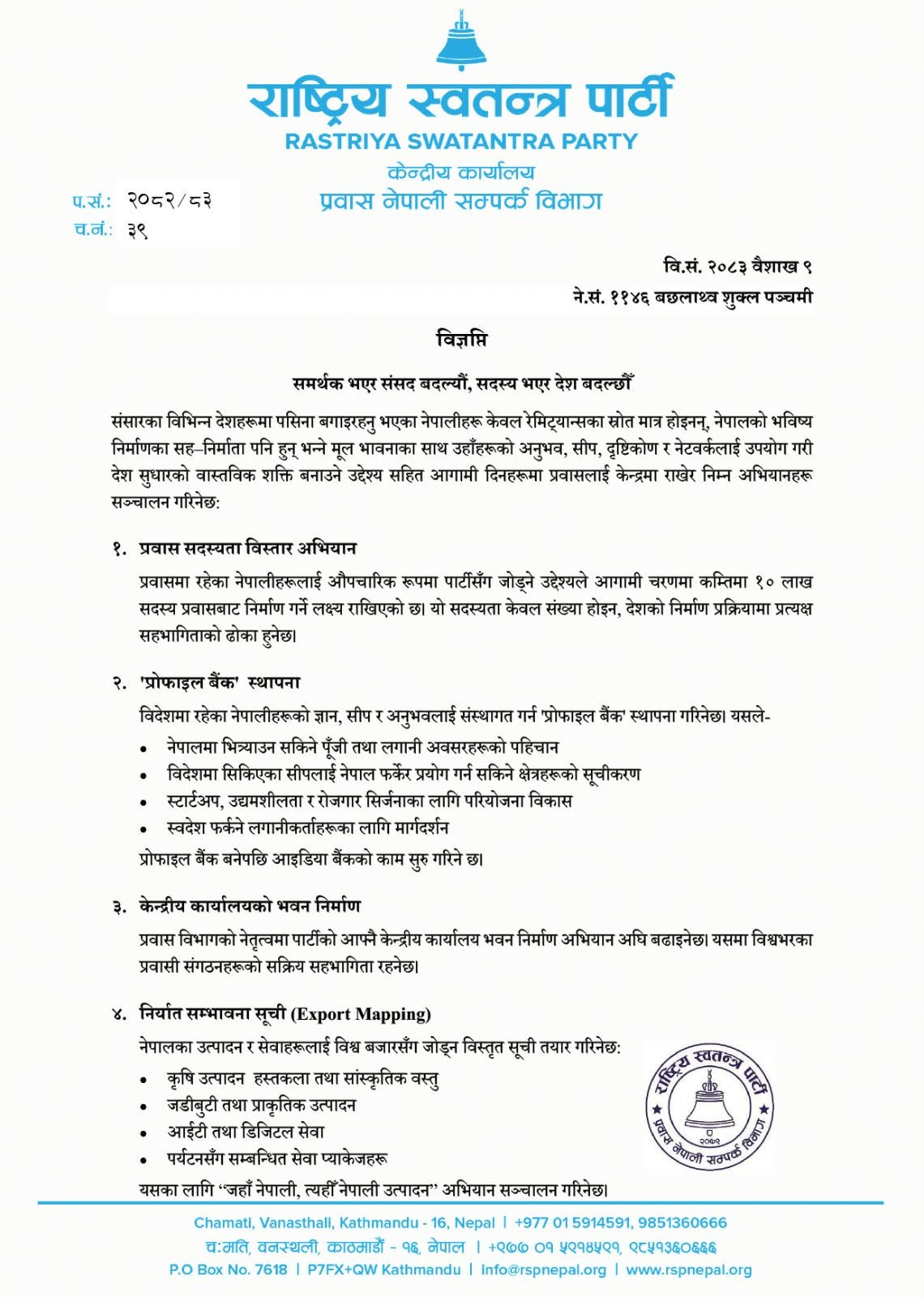 विदेशमा रहेका १० लाख नेपालीलाई पार्टीसँग जोड्ने रास्वपाको अभियान : नेपालीको ज्ञान, सीप र अनुभवलाई संस्थागत गर्न
